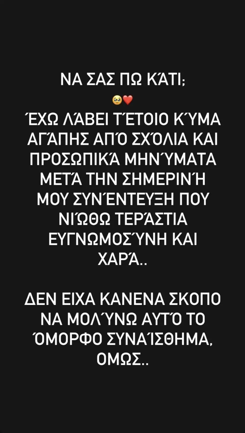 «Έχω λάβει τέτοιο κύμα αγάπης από σχόλια και προσωπικά μηνύματα, που νιώθω τεράστια ευγνωμοσύνη. Δεν είχα σκοπό να μολύνω αυτό το συναίσθημα, όμως…», έγραψε αρχικά η Αθηνά Οικονομάκου.