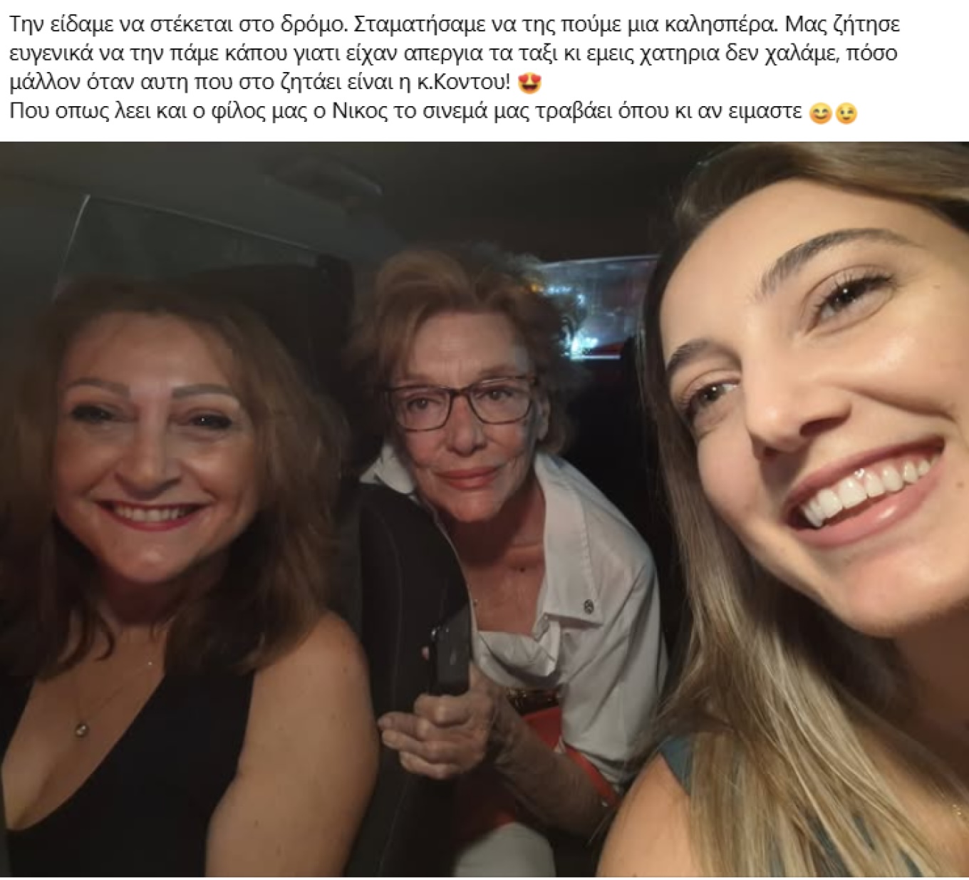 Μια τυχαία αλλά αξέχαστη συνάντηση έζησαν δύο φίλες που κυκλοφορούσαν με το αυτοκίνητό τους στο κέντρο της Αθήνας. Καθώς οδηγούσαν, αντίκρισαν τη Μάρω Κοντού να περιμένει στην άκρη του δρόμου και χωρίς δεύτερη σκέψη σταμάτησαν για να τη χαιρετήσουν.