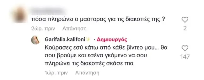 Η απάντηση της Γαρυφαλλιάς; Άμεση, αιχμηρή και με πολύ χιούμορ: «Κούρασες εσύ κάτω από κάθε βίντεο μου… θα σου βρούμε και εσένα γκόμενο να σου πληρώνει τις διακοπές. Σκάσε πια».