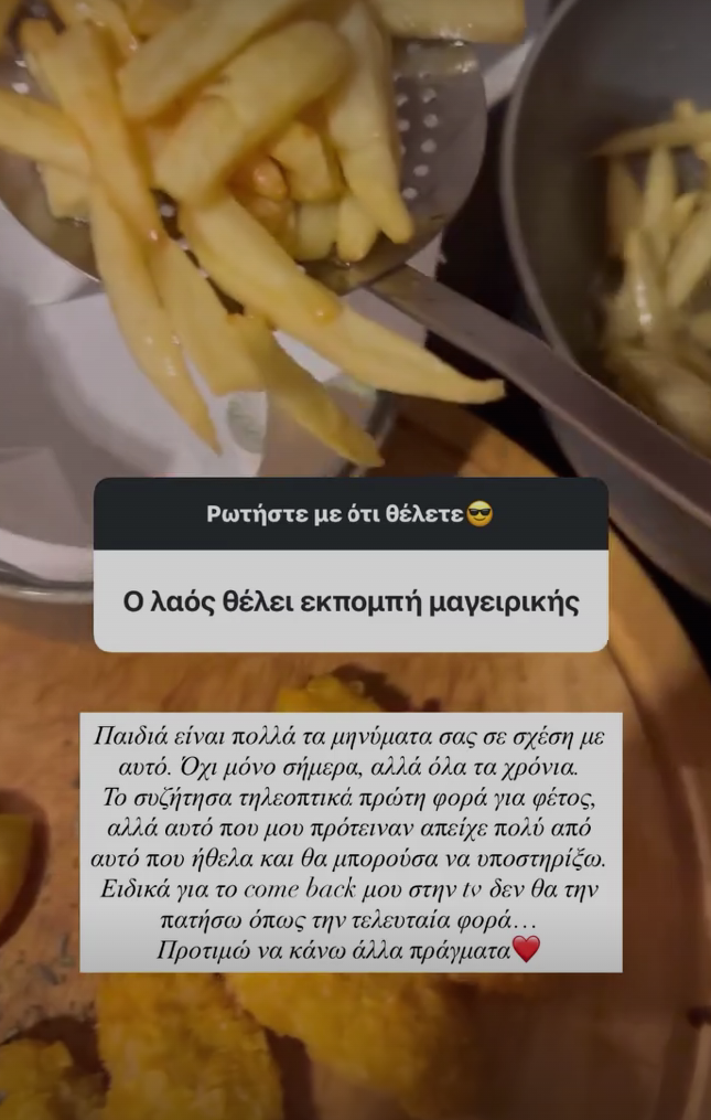 Η παρουσιάστρια αποκάλυψε πως πρόσφατα έκανε ένα δοκιμαστικό για εκπομπή μαγειρικής στον ΑΝΤ1, ωστόσο το πρότζεκτ που της προτάθηκε δεν ταίριαζε καθόλου με αυτό που είχε η ίδια στο μυαλό της.