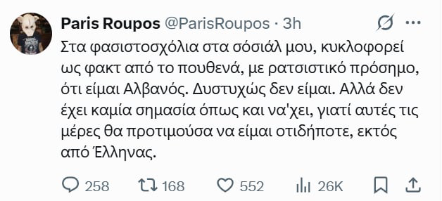«Στα φασιστοσχόλια στα σόσιαλ μου, κυκλοφορεί ως fact από το πουθενά, με ρατσιστικό πρόσημο, ότι είμαι Αλβανός. Δυστυχώς δεν είμαι. Αλλά δεν έχει καμία σημασία όπως και να’ χει, γιατί αυτές τις μέρες θα προτιμούσα να είμαι οτιδήποτε, εκτός από Έλληνας» έγραψε χαρακτηριστικά.