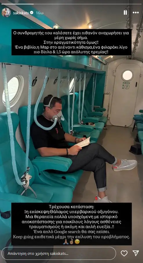 Τρέχουσα κατάσταση: 1η επίσκεψη: Θάλαμος υπερβαρικού οξυγόνου. Μια θεραπεία πολλά υποσχόμενη με ιστορικό αποκατάστασης για ποικίλους λόγους ασθένειες, τραυματισμούς ή ακόμη και απλή ευεξία. Ένα απλό Google Search θα σας πείσει. Keep going επιθετικά μέχρι την επίλυση του προβλήματος», έγραψε στην ανάρτησή του ο Σάκης Κατσούλης.