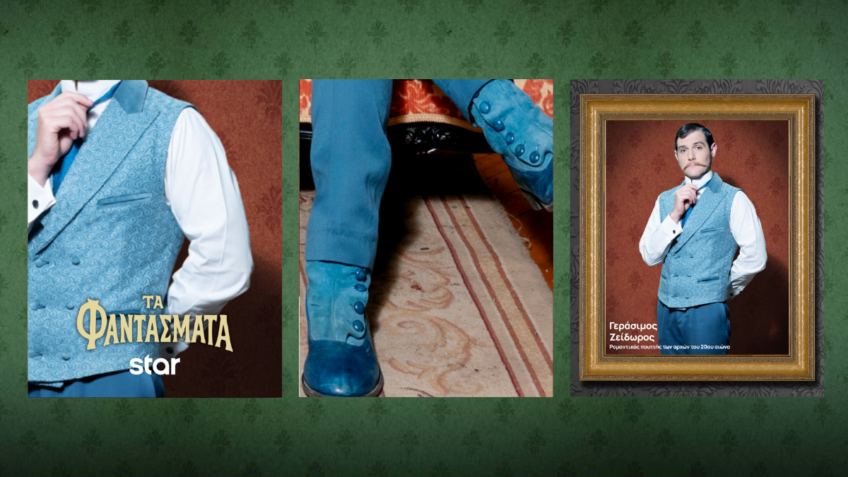 Ένα κοστούμι από ύφασμα με αναφορά στα τέλη του 19ου αιώνα, με μπροκάρ γιλέκο και ανυψωμένο κολάρο, όλα σε γαλάζιους τόνους με ειδική πατίνα και επεξεργασία. Τα παπούτσια είναι αυθεντική αναπαράσταση των παπουτσιών με κουμπιά εκείνης της εποχής.