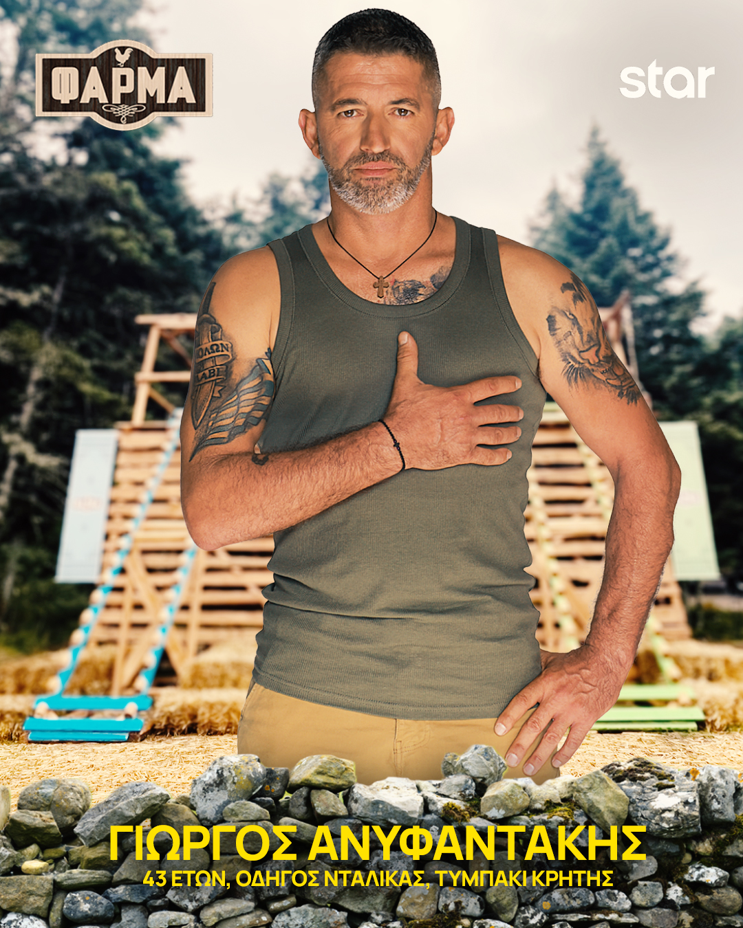 Ο Γιώργος δεν χρειάζεται πολλά λόγια για να ξεχωρίσει. Αρκεί ένα χαμόγελο, το λευκό του σαρίκι και μια μαντινάδα για να καταλάβεις ότι έχεις μπροστά σου έναν γνήσιο Κρητικό. Οδηγός νταλίκας, πρώην βοσκός, με εμπειρία σε αγροτικές καλλιέργειες, ηγετικός και ατρόμητος, στη Φάρμα νιώθει στο στοιχείο του.Δε φοβάται τίποτα, πέρα από τις «υπόγειες» στρατηγικές, αφού προτιμά τις ξεκάθαρες κουβέντες και να κοιτάει τους ανθρώπους στα μάτια.Ο ίδιος είναι φανατικός οπαδός της Φάρμας και δήλωσε συμμετοχή δίνοντας υπόσχεση στην οικογένειά του ότι θα κερδίσει για αυτούς! Και, όπως δηλώνει, έχει μάθει να τηρεί τον λόγο του.